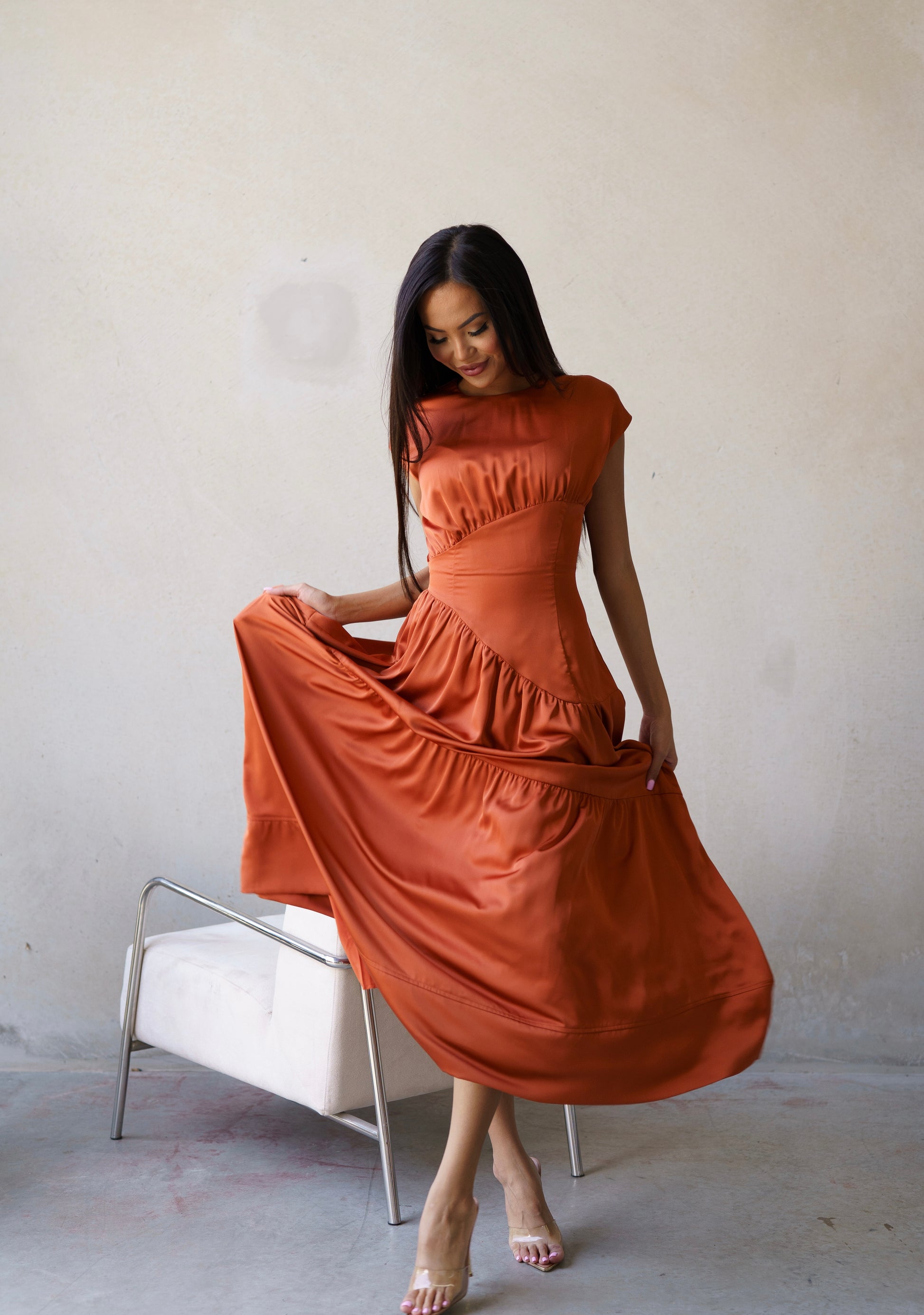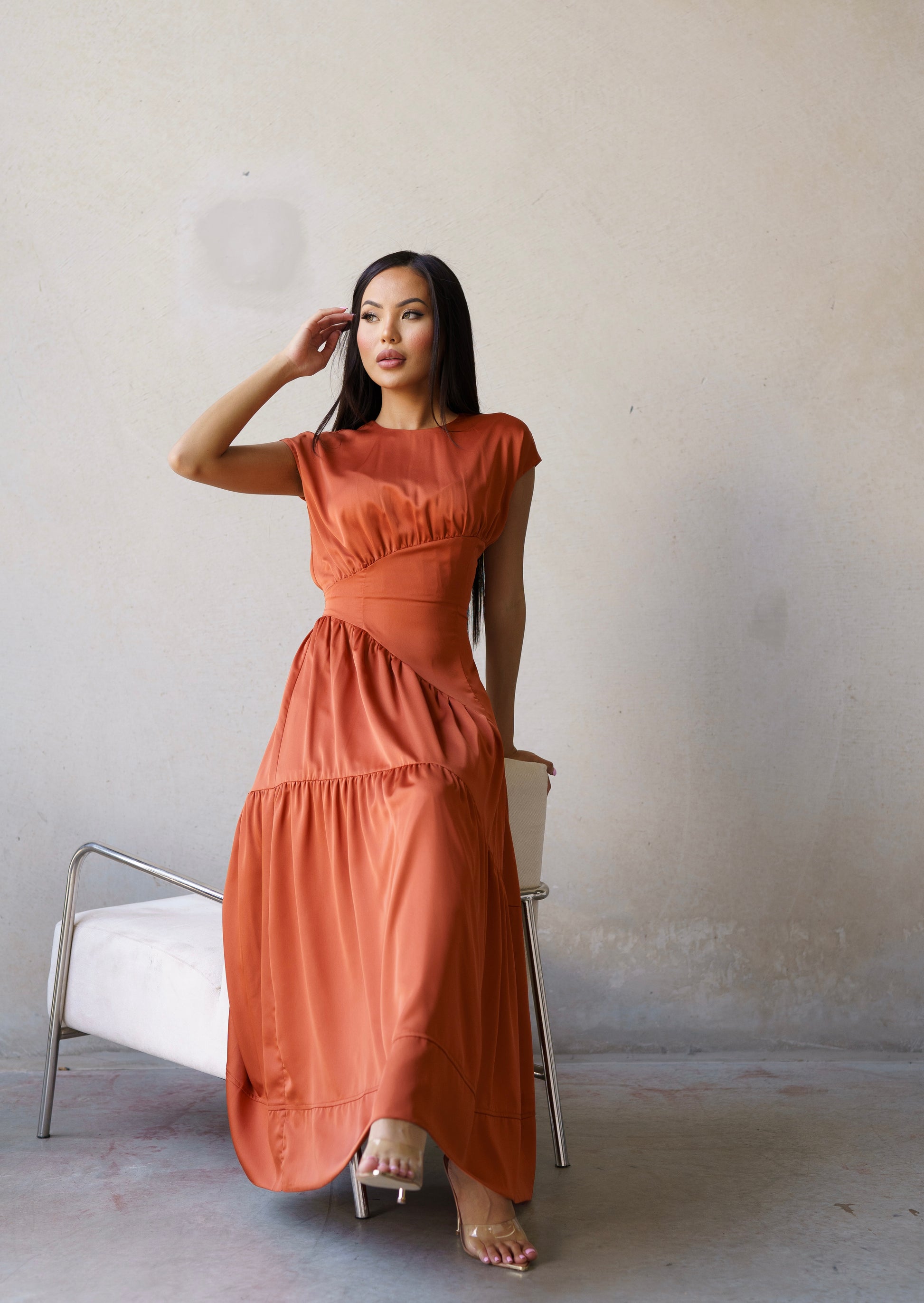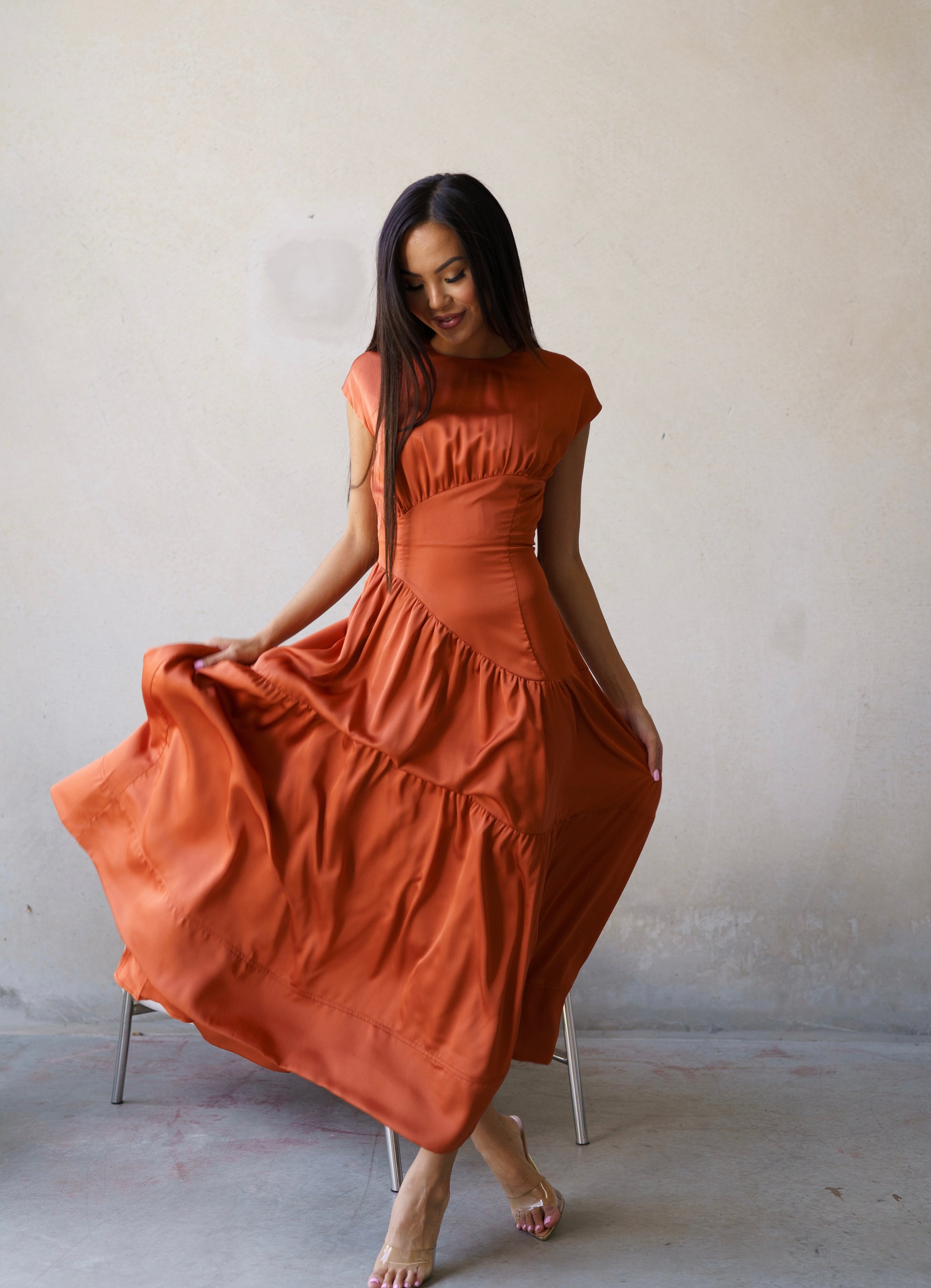 This stunning cap sleeve gown with intricate gathered tiers, corset inspired fitted waist and invisible zip at the back.